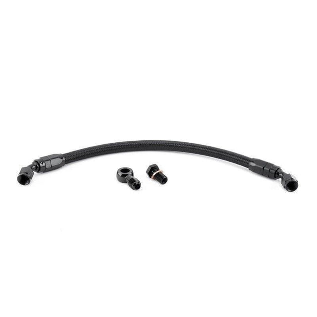 This kit replaces the OEM rubber lines with a -6AN braided line. You can attach this line to an aftermarket B-Series fuel rail with a -6AN adapter fitting. Once installed, the new line will route similar to the OEM fuel line.