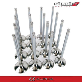 Skunk2 Alpha Series valves are manufactured from HNV3 martensitic steel (IN) and EV8 austenitic steel (EX) one-piece forgings, each valve is heat-treated using a proprietary process for extraordinary strength and durability. Alpha Series Valves feature hard chrome plating and fully machined valve heads. Other valves may appear similar, but only Alpha Series Valves feature specially designed valve head profiles to optimize airflow.