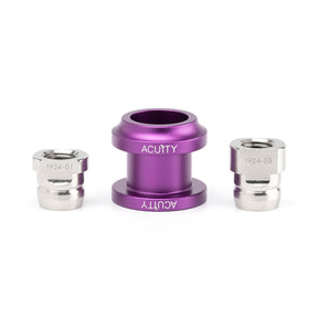 Gone are the days of sagging shift boots, broken plastic shift boot collars, and shift boot collars that don't match the diameter or style of your shift knob. ACUITY designed this Shift Boot Collar Upgrade to allow use of virtually any M10x1.5 shift knob in your Honda without sacrificing fit and finish between the shift boot and shift knob. This kit includes 2 binding nuts, one meant for flat-bottomed knobs, and the other meant for boss-bottomed knobs (like modern Civic Type R and Honda Factory Performance designs). The boot collar is reversible and can be flipped to match your knob's base diameter, whether it be a traditional narrow-bottomed knob (with a 22mm lower diameter) or the newer style wide-bottomed knobs (with a 28mm lower diameter). An integral retaining feature lets you easily pop the boot collar on and off many times without problems, so you no longer have to worry about breaking the OEM plastic boot ring when removing your shift knob. The supplied binding nuts are turned and milled from stainless steel and have flats for a 12mm open-ended wrench. The boot collar is made from 6061 billet aluminum and receives a tasteful anodized/sandblasted finish before laser etching.