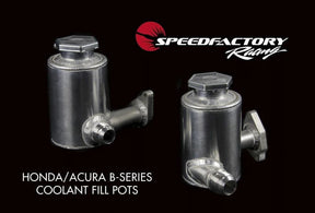 SpeedFactory Racing Honda/Acura B-Series Cooling System Fill Pots are compatible with most aftermarket radiator setups, and change the high point of your cooling system for easy filling and system air bleeding. Your cooling system's capacity will also be increased by roughly 1 quart.